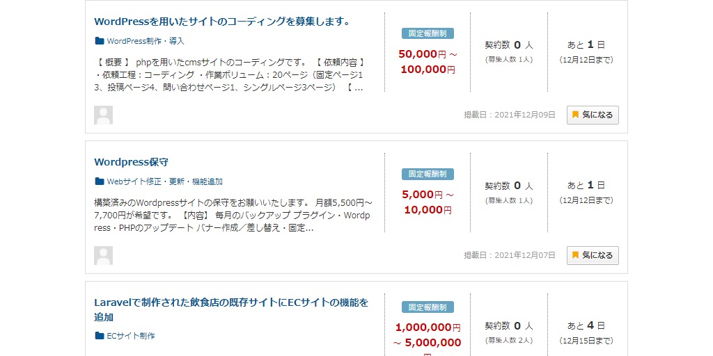 画像中央の「WordPress保守」のような案件は、プログラミングのはじめての副業案件としても最適です。この要求は難しくなく、PHPのスキルもほとんど必要ありません。