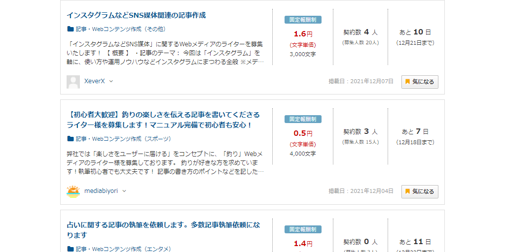 報酬単価は、文字単価 × 文字数で募集されることが多いです。得意な分野について記事を書いて報酬を得ることができるので、文章を書くのが好きな人には楽しい仕事だと思います。